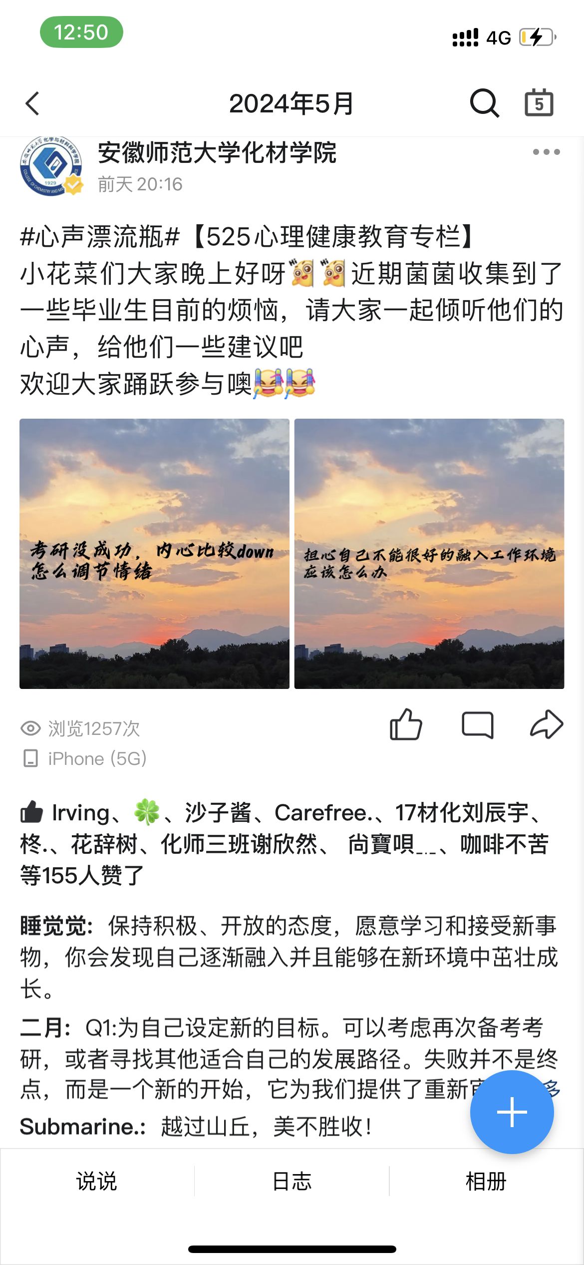 毕业生心理健康状况,解决他们对于求职就业以及升学等困惑,特开展“心声漂流瓶”活动。将他们的烦恼以匿名方式发布在本院官方平台,并邀请本院其他学生从不同角度去回答他们的困惑,帮助他们解决目前的迷惘,消除内耗情绪。