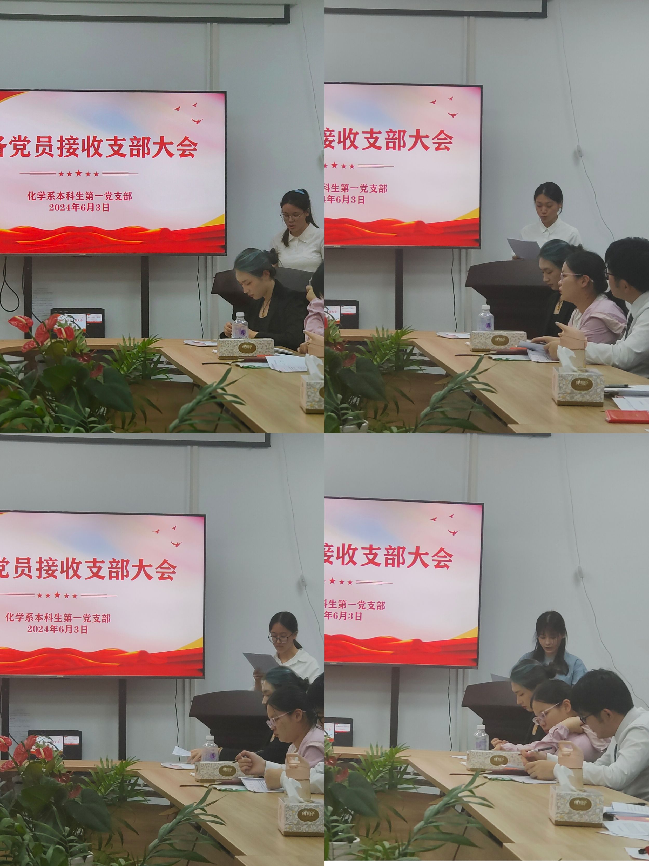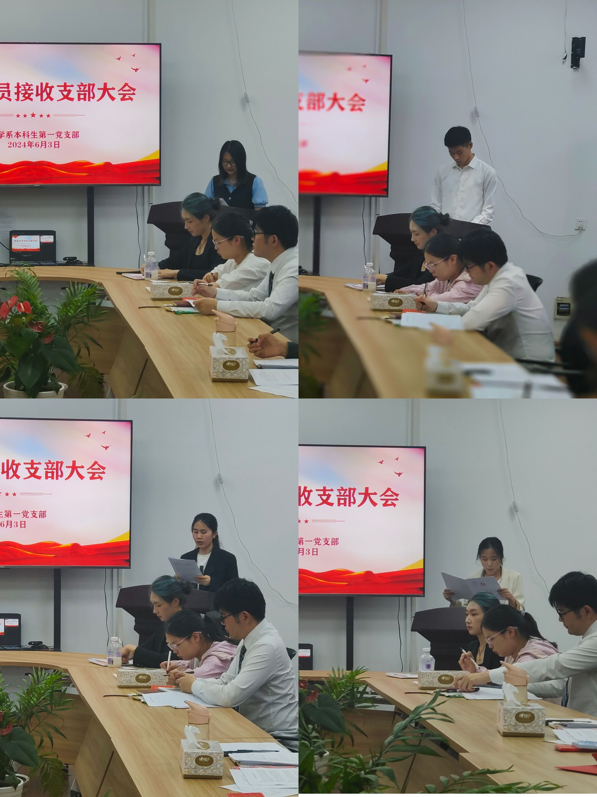 6月3日晚,支部大会严格遵照党组织接收预备党员程序召开,讨论接收桂子怡等8名发展对象为预备党员。发展对象逐一宣读《入党志愿书》,向党组织汇报自身情况。入党介绍人就思想、学习、工作等方面向大会介绍发展对象的有关情况,并对其是否同意推荐入党表明意见。随后,支委报告发展对象的审查情况。与会党员对发展对象就其思想等方面提出意见和指正,对发展对象能否入党展开充分讨论,发展对象进行表态。经过表决,大会一致同意接收桂子怡等8名同志成为中共预备党员,拟提交学院党委审核。
