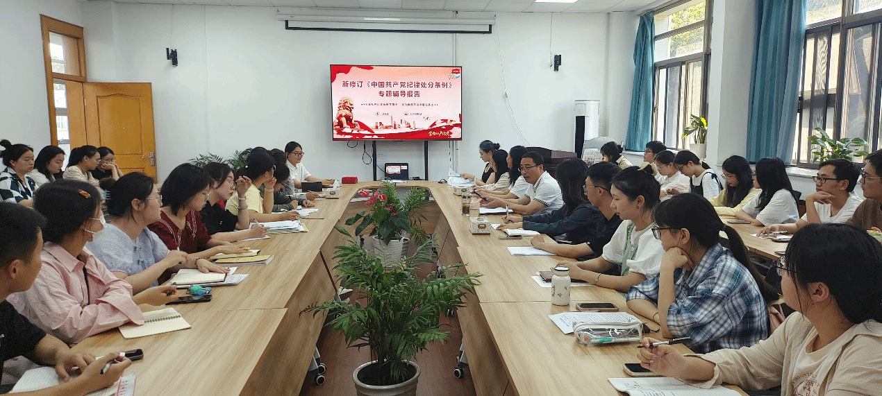 汪俊武根据新修订的《中国共产党纪律处分条例》作专题辅导报告,汪书记理论结合实际,用浅显易懂的语言从《条例》的重要意义、主旨要义和如何贯彻执行三个方面讲授了意义深刻而又生动有趣的报告,他勉励支部党员要始终坚持严的基调,不断完善纪律规矩,以严明的纪律推进党的自我革命,学生党员无论是在校期间还是步入工作岗位都要切实学纪、知纪、明纪、守纪,推进党的自我革命永远在路上。