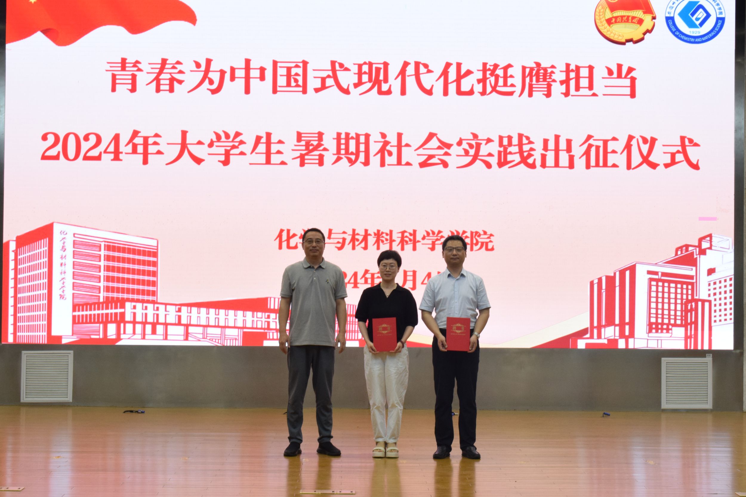 副院长崔鹏宣读了指导老师聘用决定,他强调各位受聘教师要履职尽责,认真指导团队开展实践活动,着力提升学生专业知识与社会实践相结合的能力,全方位、全过程提升学院人才培养质量。学院党委书记汪俊武、副院长周双六为指导老师颁发聘书。2022级化学工程与工艺专业谢艺雯作为暑期社会实践学生代表发言,她表示作为当代大学生,要将理论与实践紧密结合起来,把社会实践作为一门必修课来锻炼自我,要强化理论指导,做党先进理论的传播者,要立足学科专业,做乡村基层的服务者,还要坚持实干精神,做脚踏实地的实践者。