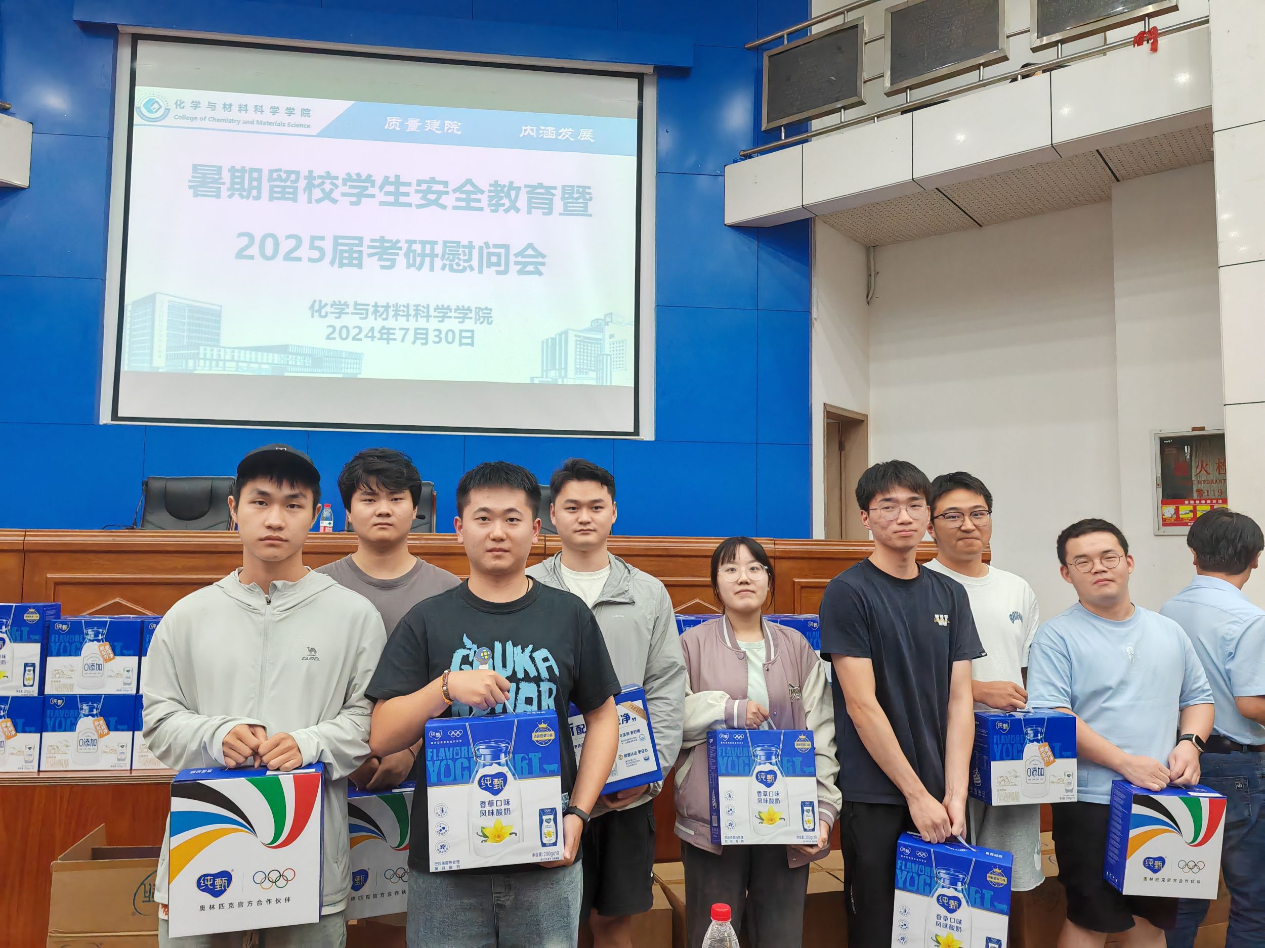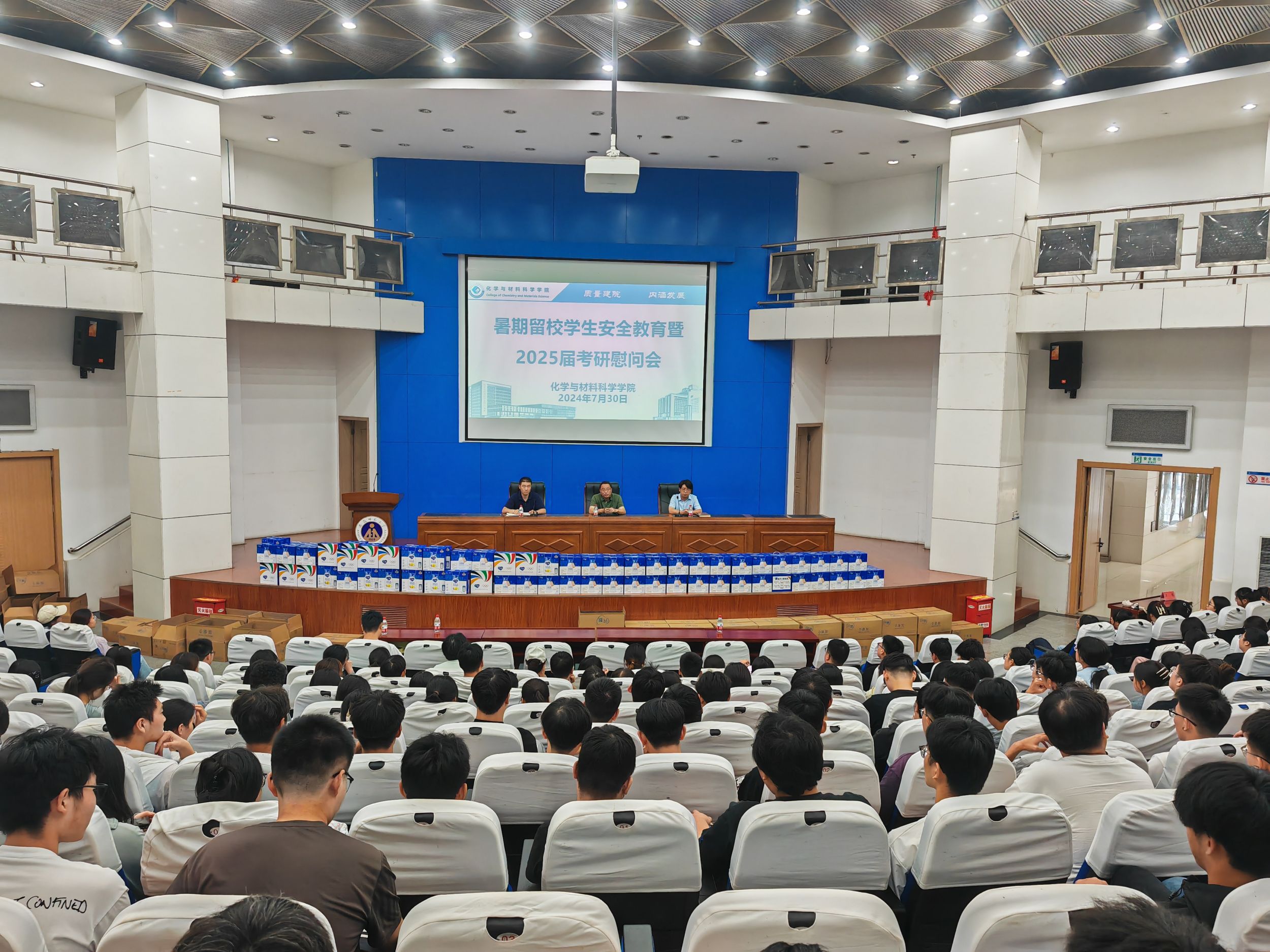 在敬文图书馆报告厅举行了暑期留校学生安全教育暨2025届考研慰问会,院党委书记汪俊武,副院长崔鹏,辅导员陶勇、梅冠东共同出席了慰问活动,为暑期备战考研留校学生送去了温暖与关怀。会议由党委副书记李古州主持。