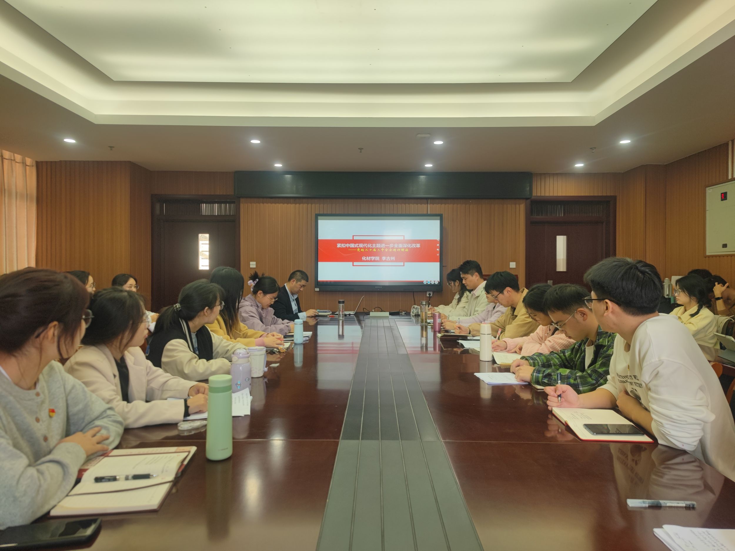 大会第一项议程,李古州以“紧扣中国式现代化主题进一步全面深化改革——党的二十届三中全会精神解读”为主题,在礼勤楼702为应化系本科生党支部及化学系本科生第二党支部全体党员开展党课教育。他从深刻认识党的二十届三中全会的主题和意义、深刻认识进一步全面深化改革的指导思想、总目标和重大原则、全面准确理解《决定》提出的进一步全面深化改革重大举措、认真抓好党的二十届三中全会精神贯彻落实这四个方面开展阐述。他强调,全体学生党员要准确把握本次全会在中国现代化进程中的历史方位,深刻领会全会的重大意义,认清自身现阶段主要任务,聚焦身边小事,切实走好脚下的路,用实际行动推动党的事业高质量发展。