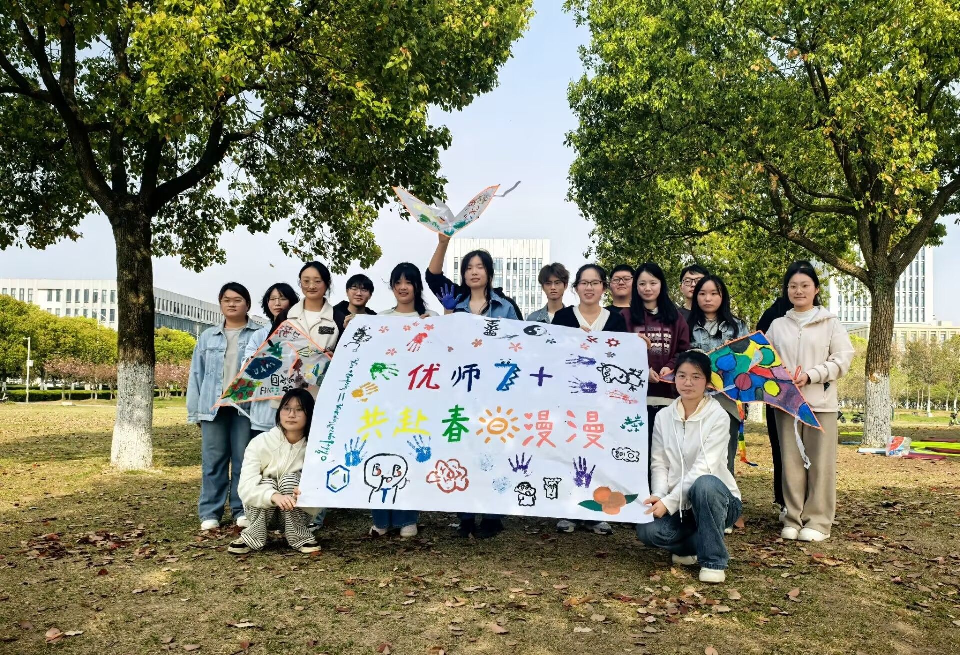 春日晴好,绿茵如毯。同学们在花津南草坪上绘制风筝,发挥自己的创意畅想,手持自制风筝奔跑嬉戏,彩鸢乘风直上,有人将压力化作“烦恼风筝”放飞高空,有人将梦想绘于纸面托付春风,用斑斓色彩书写对校园生活的热爱。