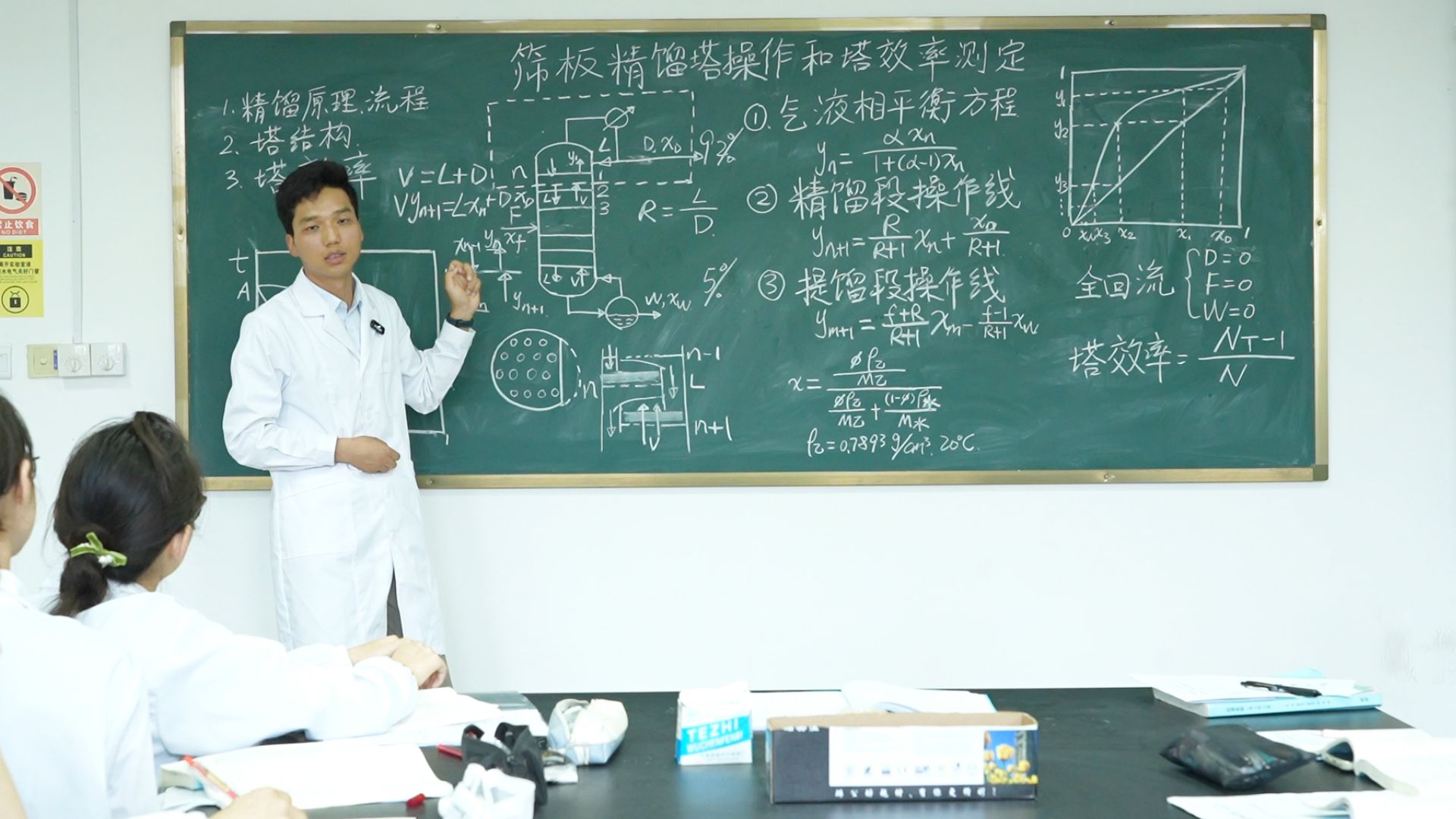 实验开始前,司家奇老师首先进行了细致的理论讲解。他从筛板精馏塔的基本构造和工作原理入手,通过展示工业级精馏塔运行数据与实验室装置参数的对比分析图,结合化工分离过程的核心理论,详细阐述了精馏操作的关键要点和塔效率测定的意义,并在黑板上画出精馏塔的结构示意图,深入浅出地讲解着每一个部件的作用,让学生们对实验的目的和背景有了清晰的认识。
