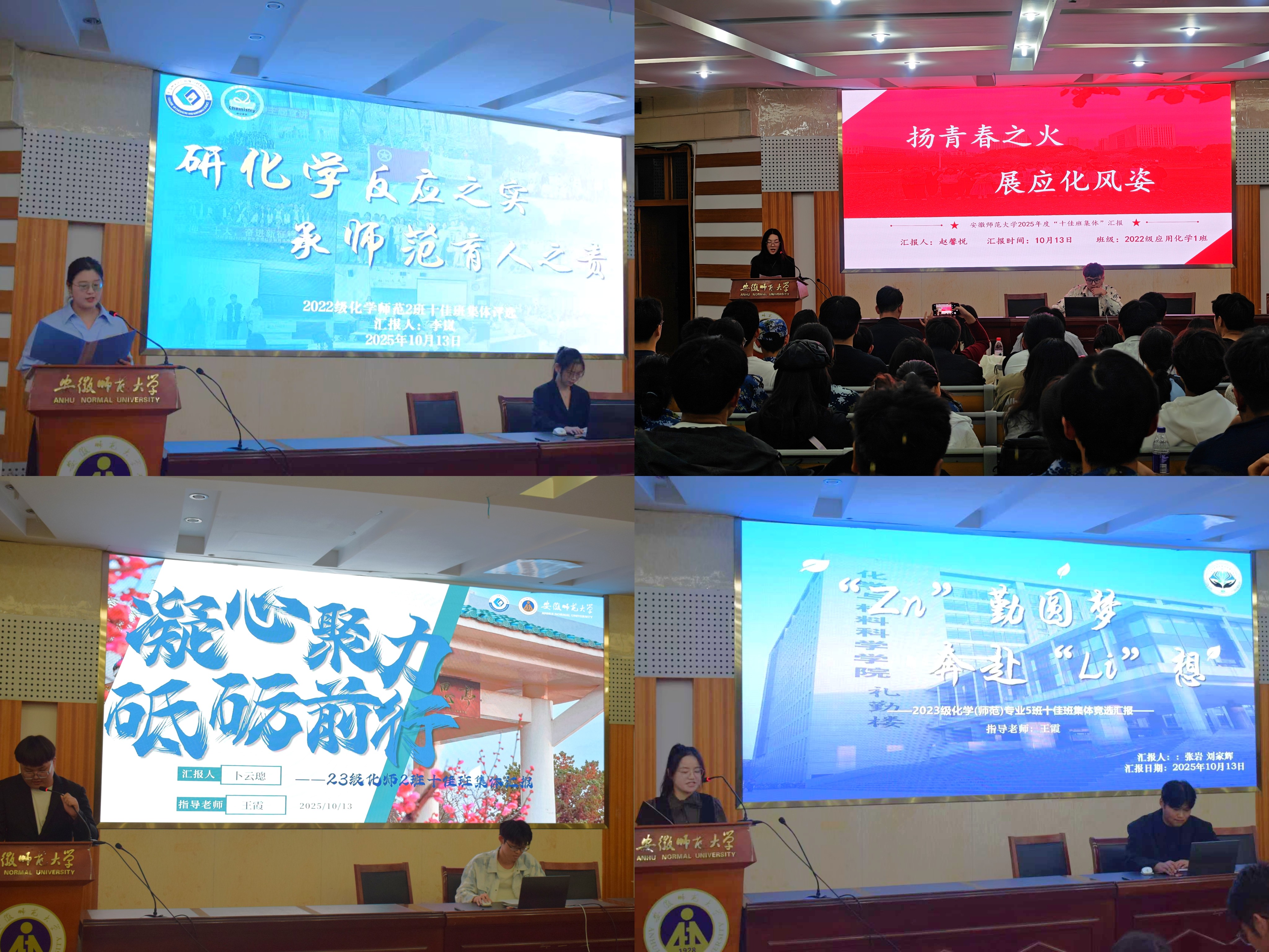 本次学院“十佳班集体”评选共有18个参评班级现场汇报。2024级化学(师范)5班、新能源材料与器件1班等,着重展示了他们从入学至今的快速融入与成长,通过一系列破冰活动、学习小组和主题团日,迅速凝聚起强大的班级向心力。2023级新能源材料与器件2班、应用化学2班的同学们分享了在实验室和项目竞赛中的探索与收获,体现了化材学子扎实的学术功底与创新意识。2022级化学(师范)2班、化学工程与工艺2班等班级,则系统梳理了过往三年的积累,并对未来的升学就业规划进行了展望,为学弟学妹们提供了宝贵的经验。各班级的演讲十分精彩,每一段文字、每一张图片,体现化材学子对于良好班风建设追求。