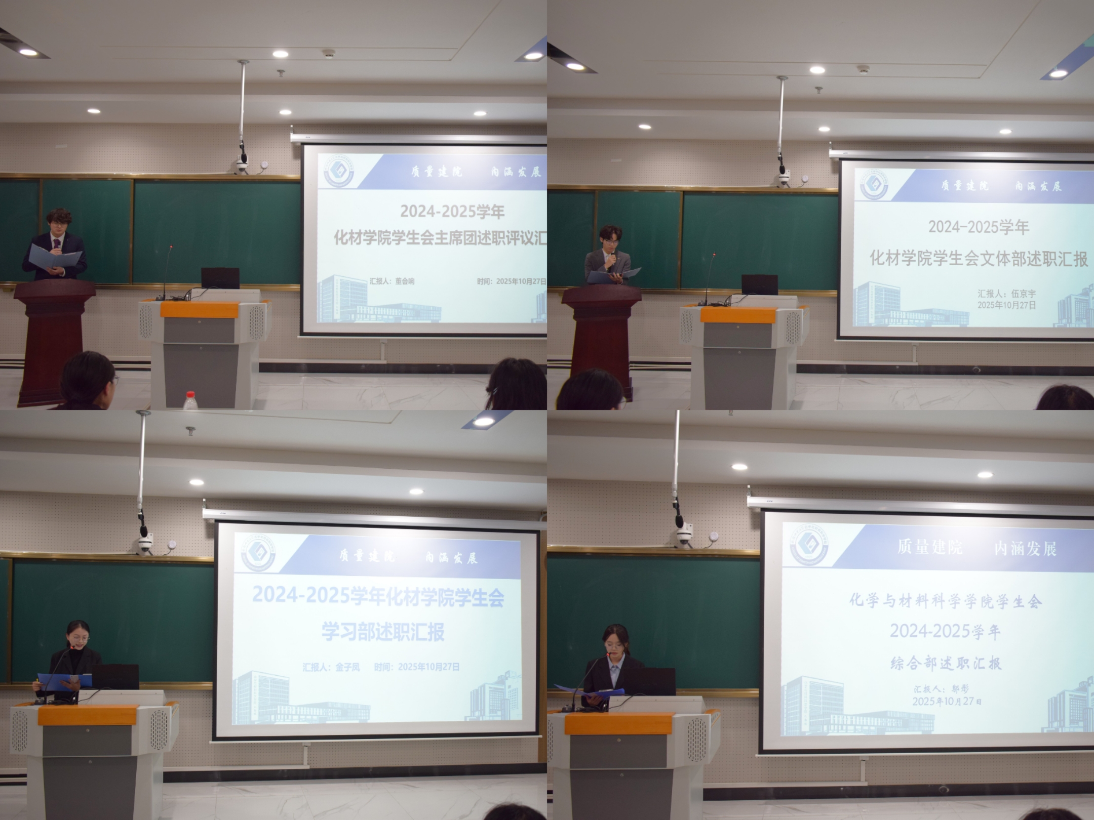 院学生会主席团成员及各部门部长依次登台述职,围绕政治素养、品德修养、学业表现、工作实绩、纪律遵守及改进方向六大核心维度展开汇报。各负责人结合部门职能,既生动呈现了上一学年在活动组织、服务保障等方面的亮点成果,也坦诚剖析了当前工作中存在的如协同效率不足、活动覆盖面待拓宽等问题,并对问题针对性提出改进方案,同时清晰阐述了下一阶段的工作规划与目标。大家纷纷表示,通过这段时间的工作实践,不仅提升了统筹协调与沟通表达能力,更深刻领悟到“学生骨干”身份背后的责任,未来将以更饱满的热情投入学院学生会工作。