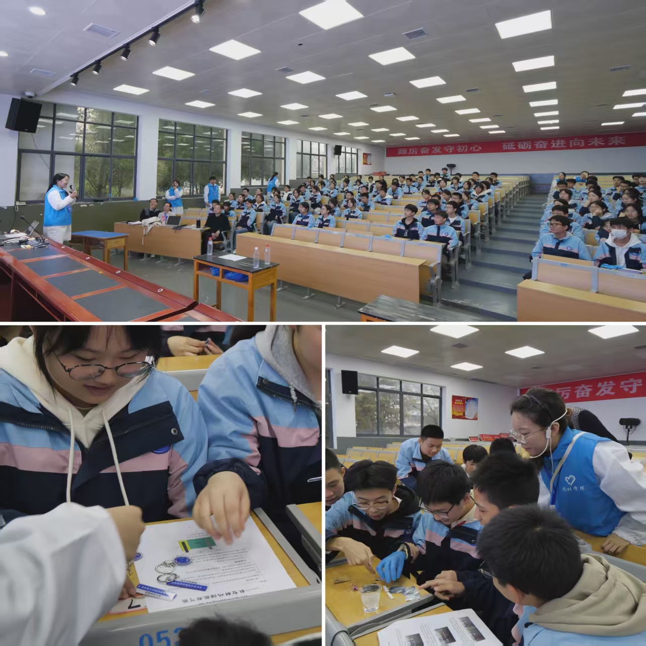 中学生科普体验活动主要进行了科学家精神宣讲、趣味化学实验演示及折纸电池水果电池设计实操三个环节。