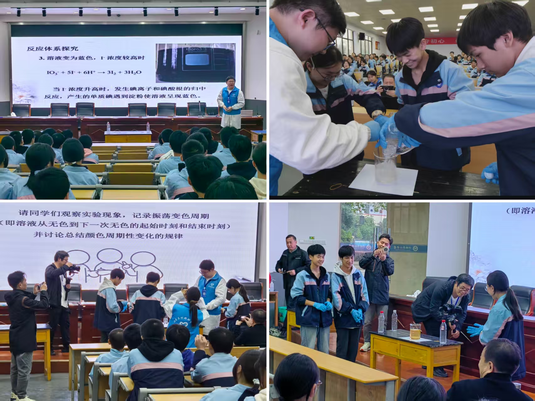 趣味化学实验环节展示的是碘钟振荡实验,瞬间将现场氛围推向高潮!志愿者精准配制三种实验溶液,与现场中学生代表共同完成此实验,当液体缓缓混合,同学们屏息凝视——“哇!变颜色了!”“又变回去了!”此起彼伏的惊叹声不绝于耳。无色溶液先是化作琥珀色,转瞬又切换为深邃蓝色,周期性的色彩流转宛如一座灵动的“化学时钟”,让同学们直呼“化学太神奇了”。志愿者趁热打铁,用通俗生动的语言讲解化学反应原理,将过氧化氢在催化剂作用下的振荡机制娓娓道来,让抽象的化学反应变得直观可感,也让同学们真切领略到化学世界的奇幻魅力。