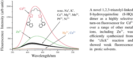 12) Hao, E.; Meng, T.; Zhang, M.; Pang, W. D.;Zhou,Y. Y.;Jiao, L.* Solvent Dependent Fluorescent Properties of a 1,2,3-Triazole Linked 8-Hydroxyquinoline Chemosensor: Tunable Detection from Zinc(II) to Iron(III) in the CH3CN/H2O System.Journal of Physical Chemistry A2011,115(29), 8234-8241. []