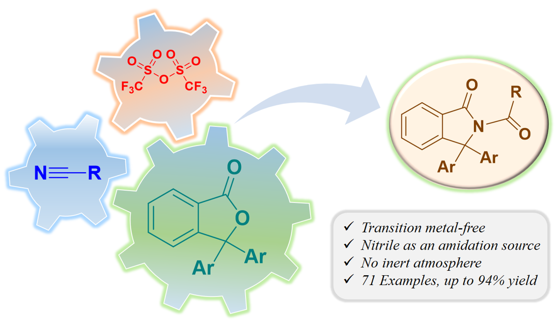 37. Tehmina Akram, Chuang Niu,* Wen-Jie Qiu, and Guan-Wu Wang*, An O-to-N Swapping Reaction via Triflic AnhydrideMediated Lactamization of 3,3-Diarylbenzofuranones with Nitriles, .