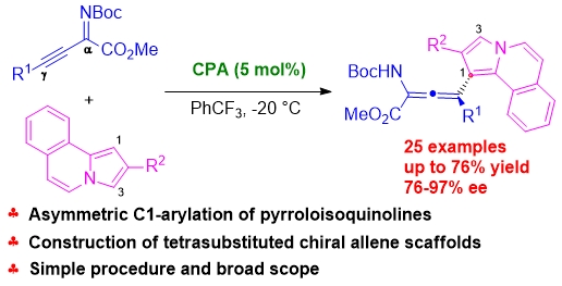 24)Xuan Zhang, Xiaoxiao Song and Qijian Ni*.Organocatalytic regio- and enantioselective C1-arylation of β,γalkynyl-α-imino esters with pyrrolo[2,1-a]isoquinolines,Chem. Commun.2024,60, 831-834.