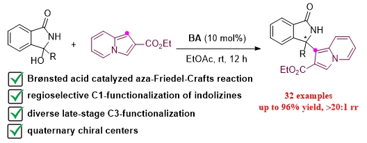 25)Zhiming Zhu, Qianling Wu, Xiaoxiao Song* and Qijian Ni*. Thermodynamic Controlled Regioselective C1-Functionalization of Indolizines with 3-Hydroxyisoindolinones via Brønsted Acid Catalyzed aza-Friedel–Crafts Reaction, J. Org. Chem. 2024, 89,2794-2799.