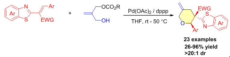 16) Xiaoxiao Song*, Lei Xu,Qijian Ni*. Highly diastereoselective synthesis of 3-methylenetetrahydropyrans by palladium catalyzed oxa-[4 + 2] cycloaddition of 2-alkenylbenzothiazoles,Org. Biomol. Chem.2020,18, 6617-6621.