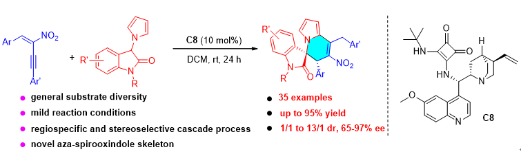 18)Qijian Ni*, Xuyang Wang, Da Zeng, Qianling Wu, Xiaoxiao Song*.Organocatalytic Asymmetric Synthesis of Aza-Spirooxindoles via Michael/Friedel-Crafts Cascade Reaction of 1,3-Nitroenynes and 3-Pyrrolyloxindoles,Org.Lett.2021,23, 2273-2278.