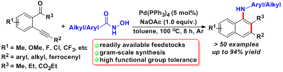 Zuo, Youpeng; He, Xinwei*; Tang, Qiang; Hu, Wangcheng; Zhou, Tongtong; Yongjia Shang *. Palladium-Catalyzed Cascade Decarboxylative Amination/6-endo-dig Benzannulation of o-Alkynylarylketones with N-Hydroxyamides to Access Diverse 1-Naphthylamine Derivatives.Org. Lett., 2020, 22,10, 3890-3894.