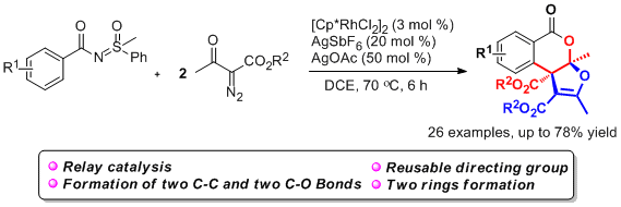 Chen Yang, Chen Chen, Shunfan Li, Xinwei He, Youpeng Zuo, Wangcheng Hu, Tongtong Zhou, Jian Wang,* and Yongjia Shang*, Rh(III)-Catalyzed Relay Double Carbenoid Insertion and Diannulation of Sulfoximine Benzamides with α Diazo Carbonyl Compounds: Access to Furo[2,3 c]isochromenes. Org. Lett., 2020, 22,7, 2506-2511.(封面文章)