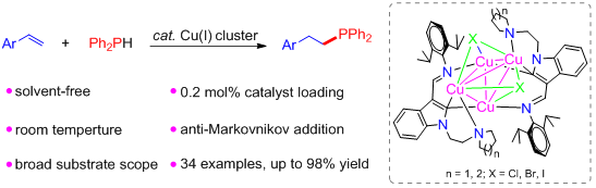 (2) Qingbing Yuan; Zeming Huang; Weikang Wu; Dongjing Hong; Shan Zhu; Jieding Wei; Shuangliu Zhou; Shaowu Wang ; Halide-bridged tetranuclear organocopper(I) clusters supported by indolylbased NCN pincer ligands and their catalytic activities towards the hydrophosphination of alkenes, Dalton Transactions, 2022, 51, 17795−17803.