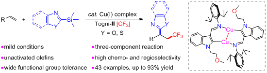 (1) Qingbing Yuan; Zeming Huang; Zhuo Chai; Dongjing Hong; Shan Zhu; Shuangliu Zhou; Xiancui Zhu; Yun Wei; Shaowu Wang ; Indolyl-based Copper(I) Complex-Catalyzed Intermolecular Trifluoromethylazolation of Alkenes via Radical Process, Organic Letters, 2022, 24, 8948−8953.