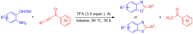27) Acid-Promoted C-C Triple Bond Cleavage of Ynones for the Synthesis of Benzo[d]oxazoles/Benzo[d]thiazoles and 1-Arylethan-1-ones, Zi-Yi Guo, Ke-Ru Li, Hang Li, Xu Wang, Ji-Tan Zhang,* Mei-Hua Xie,* Eur. J. Org. Chem. 2022, DOI: 10.1002/ejoc.202200858.
