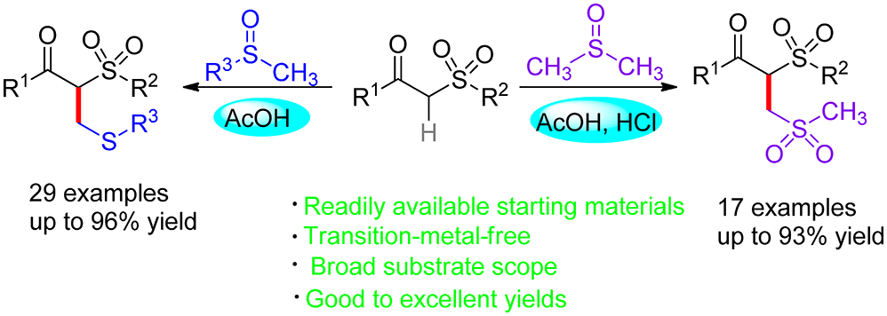 17) Acid-Controlled Access to β‑Sulfenyl Ketones and α,β-Disulfonyl Ketones by Pummerer Reaction of β‑Keto Sulfones and Sulfoxides, Jian Fan, Yiming Zhao, Jitan Zhang, Meihua Xie*, Yuzhong Zhang*, J. Org. Chem. 2020, 85, 691.