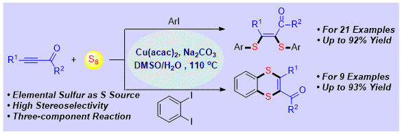 26) Cu-catalyzed Diarylthiolation of Ynones with Aryl Iodides and Elemental Sulfur: An Access to Tetrasubstituted (Z)-1,2-Bis(arylthio)alkenes and Benzo[b][1,4]dithiines, Yiming Zhao, Xu Wang, Ziyi Guo, Hang Li, Jitan Zhang,* Meihua Xie,* J. Org. Chem. 2022, DOI: 10.1021/acs.joc.2c01575.